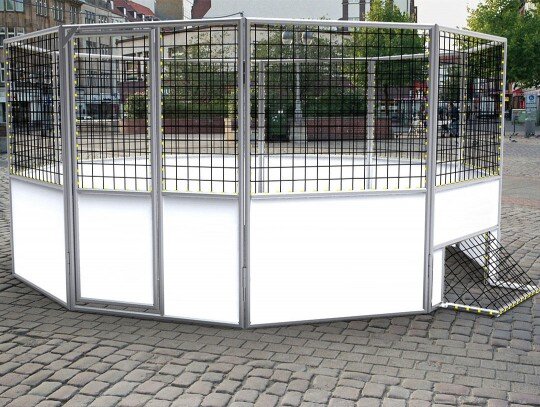 La construcción del marco de las canchas de fútbol se compone de aluminio de alta calidad. Bandas laminadas de plástico resistente tienen una altura de aproximadamente 100 cm y son de alrededor de 1 cm de espesor. La Pista completa consta de 7 segmentos de aluminio KU 2 con puerta integrada y 1 segmento con puerta de acceso integrado.