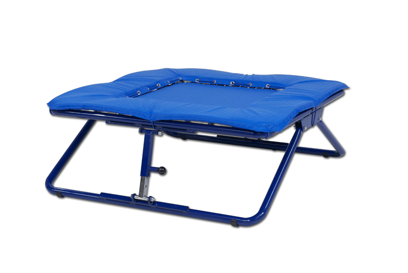 Trampolín elástico plegable, con inclinación ajustable, fuerte estructura tubular de acero pintado, con patas de apoyo de goma. La inclinación puede ser regulada por pinza automática, en el tubo doble cromado. Almohadilla de rebote central de nylon. Dimensiones 125x125 cm.