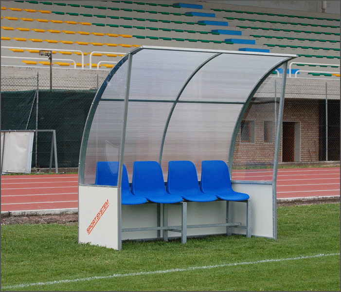 Banco para suplentes. Sólida construcción en acero galvanizado en caliente, para ser fijado al suelo, recubierto en la parte superior con paneles de células transparentes de policarbonato de 6 mm y con paneles en hpl blancos resistentes al agua en la parte inferior. Equipado con banco corrido en madera o con asientos plásticos de colores.