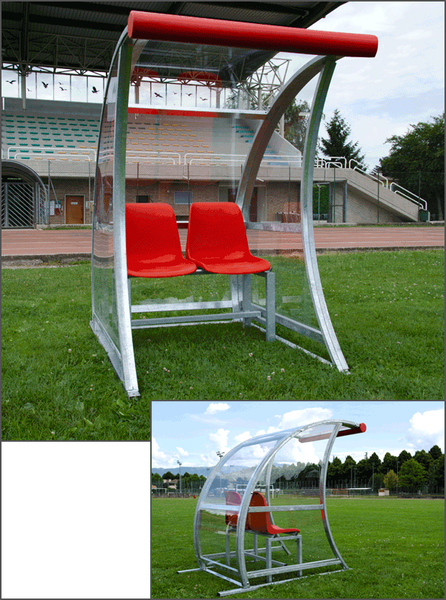 Banquillo auxiliares a una altura baja (165 cm), una estructura de acero galvanizado, de 3 mm de paneles de policarbonato transparente, asientos de polipropileno, bordes de protección.