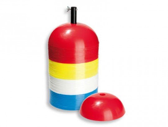 Este conjunto es ideal para los deportes de la escuela, la formación del club o deportes recreativos. El conjunto se compone de 40 conos, en los colores blanco, rojo, azul y amarillo. La cantidad de hemisferios marcado es de 9 cm. El diámetro de la superficie de exposición es de 19,5 cm. Los hemisferios son de plástico durable. Los hemisferios de formación son resistentes a la intemperie. Son adecuados para su uso en la sala y en la pista deportiva al aire libre.