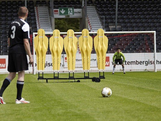 Juego se compone de unas ruedas tranvías y 5 maniquíes. Hecho de plástico ABS, reforzada, con 2 pasadores de acero y una articulación flexible. Con la ayuda de pasadores, kick maniquíes pueden enchufarse directamente en la tierra o en el carro de forma selectiva en un campo de hierba, con el fin, por ejemplo, para usar en césped artificial.