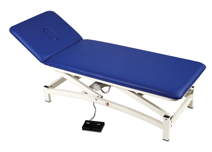Camilla de revisación médica fabricada en dos secciones acolchadas y recubiertas de vinilo. Ajustable electrónicamente en altura e inclinación.
