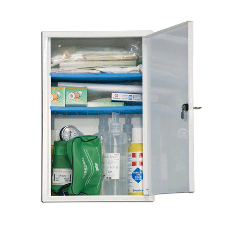 Gabinete de primeros auxilios para montar a la pared con kit de primeros auxilios.