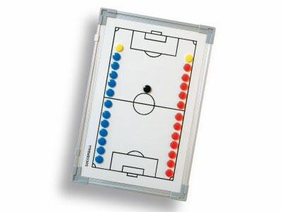 Pizarra magnética para tácticas para todo el entrenador de fútbol. Se puede utilizar de forma universal, en el entrenamiento de fútbol para instrucciones tácticas, en el deporte escolar de base o en un partido de fútbol para las instrucciones finales y la designación de la formación. Como un accesorio para este tablero existen imanes (cada 11 azul y rojo, amarillo y negro 2) y una pizarra blanca marcadores en azul. En uno de los lados de dos perchas de deslizamiento están unidos, por lo que puede ser montado en la pared, ya sea temporal o incluso estacionaria. El panel tácticas está hecho de aluminio